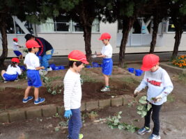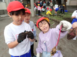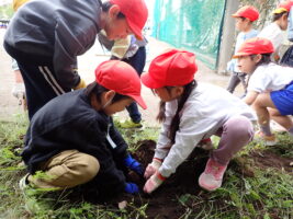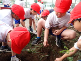 生活科で育てていたさつまいもが大きく育ちました。子ども達が楽しみにしていた「さつまいもほり」の日です。軍手を付けて、気合の入った1年生!一生懸命さつまいもを見つけ、友達と協力して掘っていました。「あった!」「大きなおいもを見つけたよ!」「小さくてかわいい!」とあちらこちらから歓声が上がっていました。