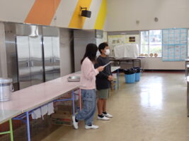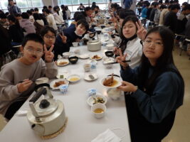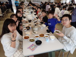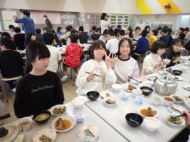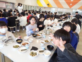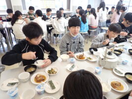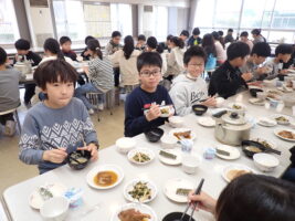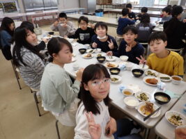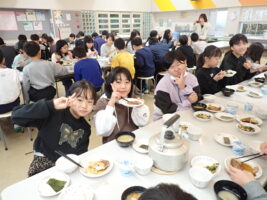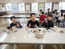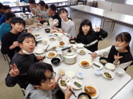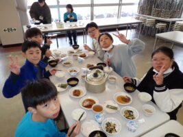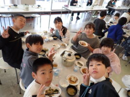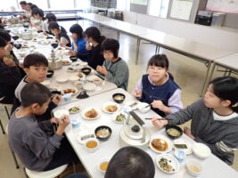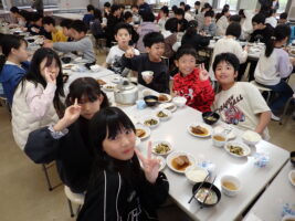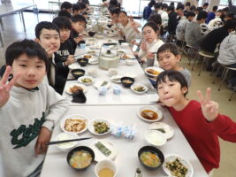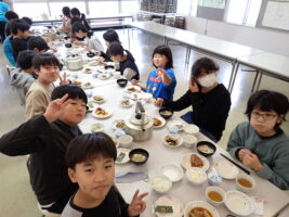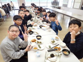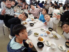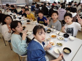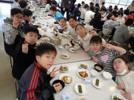 【5年生】大貫海浜学園⑨ 朝ごはん 青木北小の様子 2025/11/19 大貫での2回目のメニューは、海の街ならではの「あこうだいの煮物」「のり」、ほかにも炒め物や豚汁もあり、子どもたちからは「朝から豪華だな!」と声が上がっていました。ごはん・豚汁はおかわりもしてたくさん食べていました。これで今日のハイキングもばっちり!!