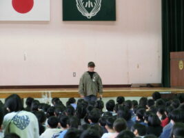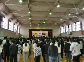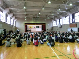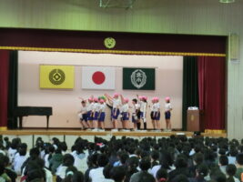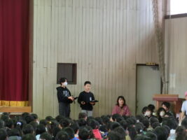 毎週行われている朝会ですが、様々な委員会や児童会などに所属している児童たちが司会役をしたり劇やクイズ、合奏などをしたりしています。
