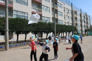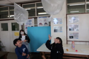 【3年生】図工 青木北小の様子 2026/04/28 図工「ふわふわ空気 つんで つなげて」の学習を行いました。空気を入れて膨らませたビニル袋の心地よさを楽しむ造形遊びの題材です。「やわらかい!」「気持ちいい!」「友達のものとつなげてベットができた!」「リボンや羽ができたよ!」と自分なりのイメージを膨らませて活動していました。活動後は、材料のビニル袋をきれいにたたんで片づけをしました。